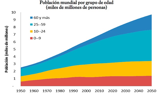 Para el 2050, el mundo tendrá una población superior a los 9 mil 500 millones de habitantes (figura 2), la Organización de las Naciones Unidas para la Alimentación y la Agricultura (FAO), considera que se debe incrementar en al menos un 60% la producción de alimentos a nivel mundial para poder atender el crecimiento de esta demanda.