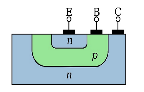 La Figura 5 muestra una representación conceptual de la estructura de un transistor de unión, tipo NPN. Como puede observarse, la base (tipo P), de dopaje débil y gran resistividad, separa las regiones semiconductoras de tipo N. La unión base-colector es mucho mayor que la unión emisor-base. Debido a ello, y a que el dopaje del emisor es más elevado que el del colector, los BJT son asimétricos, es decir, que los terminales emisor y colector no son intercambiables ademas esto podría ocasionar diferentes comportamientos en nuestros circuitos.