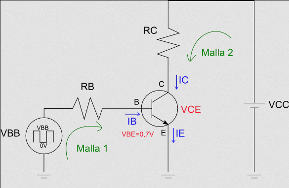 Como resultado de la polarización en un transistor se producen tres corrientes: la de base (Ib), la de emisor (Ie) y la de colector (Ic). Debido a que la unión BE está polarizada directamente, los portadores mayoritarios de ambas regiones son obligados por el voltaje VBB a cruzar la unión y