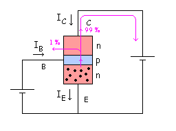 combinarse mutuamente. En el caso de un transistor NPN, esto significa que una parte de los electrones suministrados por el emisor (del 1%) se combinan con los pocos huecos disponibles en la base. Esto origina una corriente de base (Ib) relativamente pequeña.