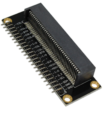 - Conector perimetral: el total de 25 pines en el conector perimetral le permite conectar varios sensores y actuadores, acceder a las líneas de E/S y conectarse a la alimentación y tierra. Incluyen una matriz de LED, dos pulsadores, un bus I2C y un SPI. Los pines 0, 1, 2, 3V y GND están expuestos como conectores en forma de anillo, que le permiten conectar fácilmente conectores tipo caimán o banana. Los pines 0, 1 y 2 son especializados para la detección capacitiva. Para accesar a todos lo pines por medio de headers o en una protoboard, puede hacer uso de un conector como en la figura 4, en nuestra tienda virtual contamos con otros conectores que pueden ser de su interés.
