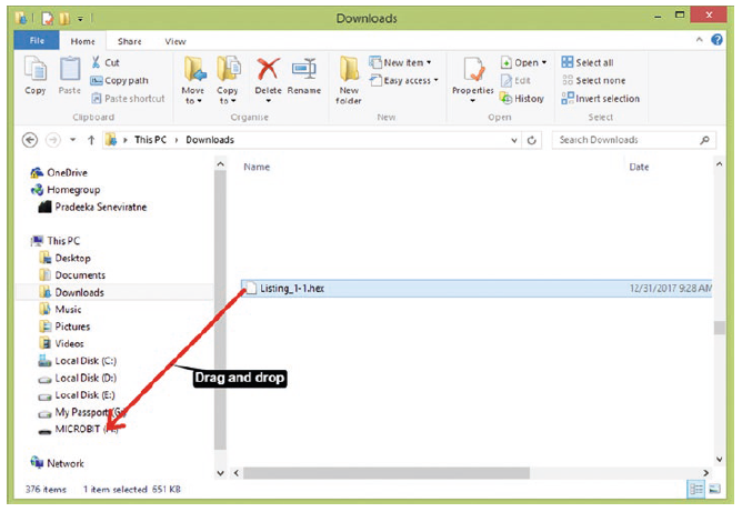 Después de escribir estas líneas de código lo único que deberá hacer es guardar el archivo con el nombre que desee, en esta ocasión tomamos el que nos da el editor por default «Listing_1-1.hex», posterior a ello descargamos el archivo hexadecimal en en botón que dice «Download» y nos iremos a descargas para arrastar el archivo con el mouse y soltarlo en la unidad microbit que se nos asigno figura 8 (asumiendo que la micro:bit ya esté conectada a tu pc).