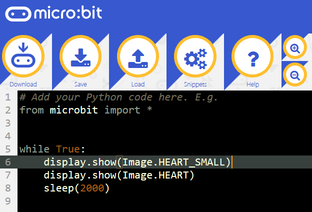 Puede usar el editor en línea de Python alojado en http://python.microbit.org/editor.html figura 7, para escribir el código de MicroPython para micro: bit y obtener el archivo hexadecimal del código para el flasheo. Esto es lo que necesitará escribir para ejecutar el programa MicroPython.