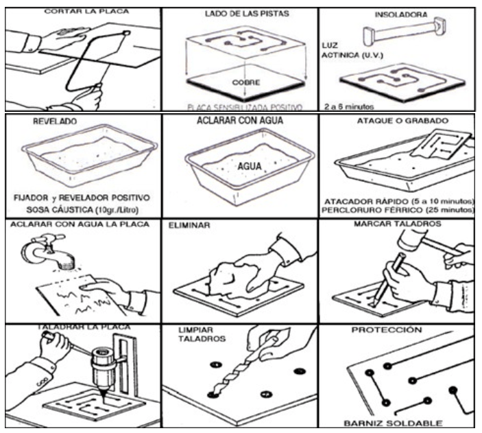 2. Con las placas de PCB desnudas elegidas y disponibles, el siguiente paso es crear las pistas requeridas en la placa y eliminar el cobre no deseado. Para obtener el patrón correcto de pistas, se utiliza un proceso de planchado directo o el proceso fotográfico como vemos en la figura 13 y 14 respectivamente.