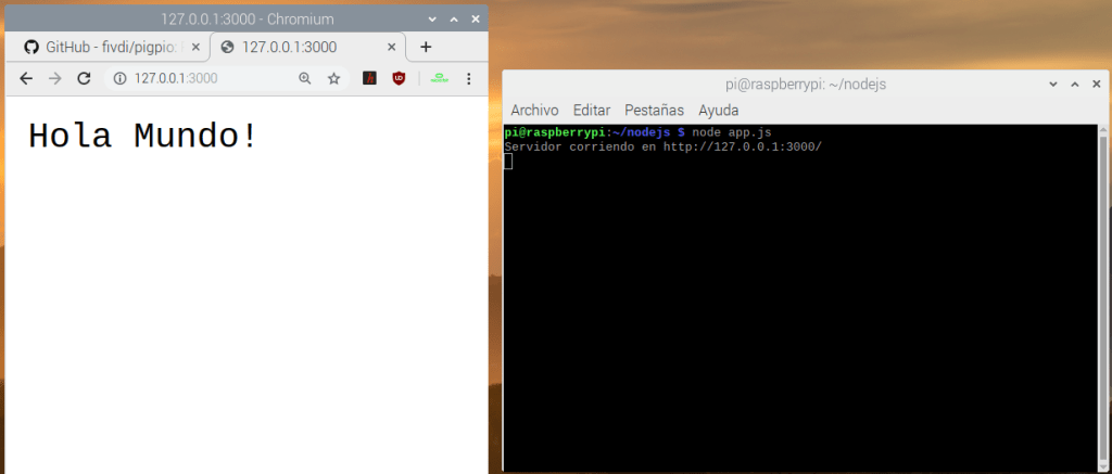 De esta forma solo bastará con navegar a nuestra carpeta nodejs y escribimos el comando node app.js y enter, cabe mencionar que siempre que se desee ejecutar un programa de nodejs hay que anteponer la palabra node y el nombre del programa. Ahora abrimos el navegador Chronium de Raspberry Pi y escribimos la dirección especificada en el código http://127.0.0.1:3000/ y veremos algo como en la siguiente figura: