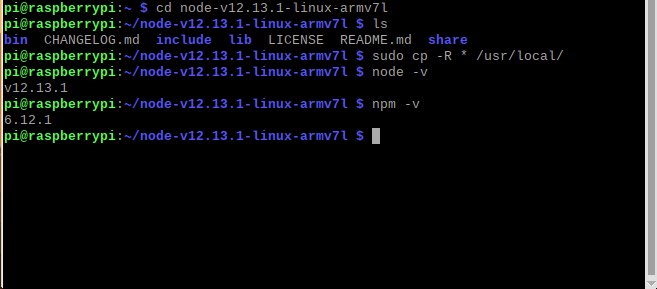 5.- Abriremos de nuevo nuestra terminal si es que se cerró, y sino es así simplemente escribiremos «ls» (sin las comillas) para asegurarnos del nombre de la carpeta que se extrajo ya que será necesario para ejecutar los siguientes comandos e instalar nodejs
