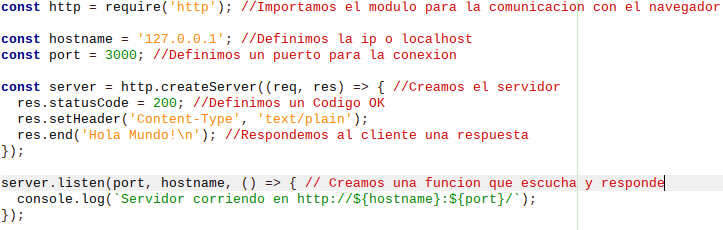 Ya en Geany creamos un nuevo archivo que guardaremos con el nombre de app.js en nuestra carpeta nodejs, aunque también se pude optar por cualquier otro nombre, y escribimos el siguiente código: