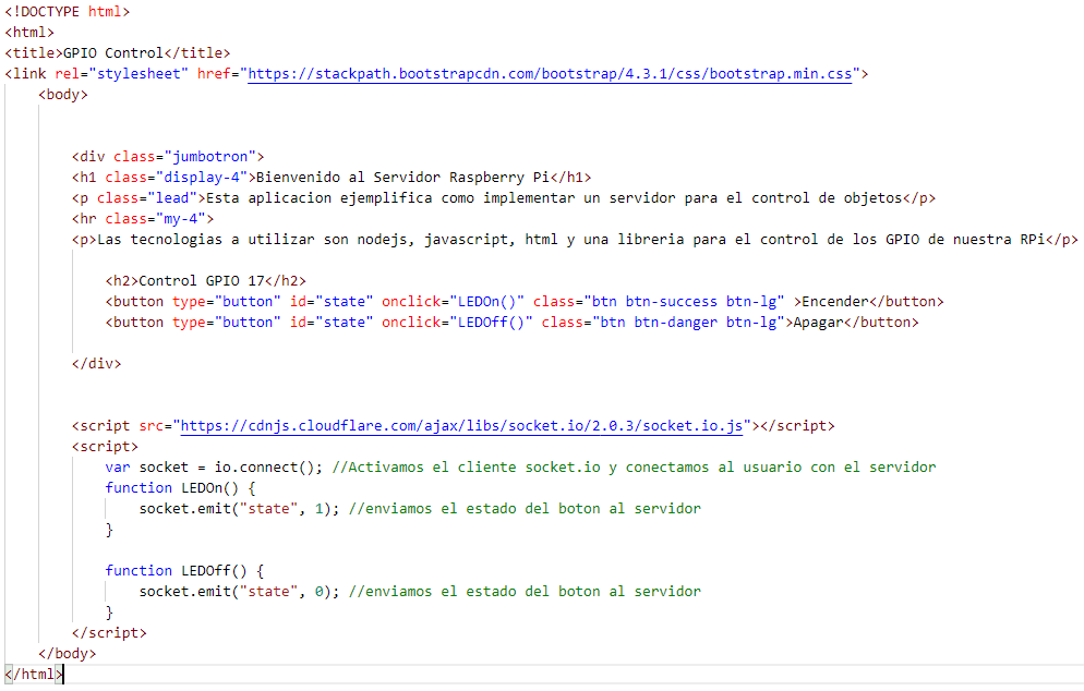 También podemos notar en el archivo index.html que los botones son los que realizan como tal la interacción con nuestro servidor web (ServerLed.js) mediante la funciones LEDon() y LEDoff() las cuales envían un 1 o un 0 respectivamente con una variable testigo entre los dos archivos que es «state» la cual comunica la interacción de los botones con el servidor el cual a su vez de la orden a Raspberry Pi de que pin colocar en 5V o 0V.