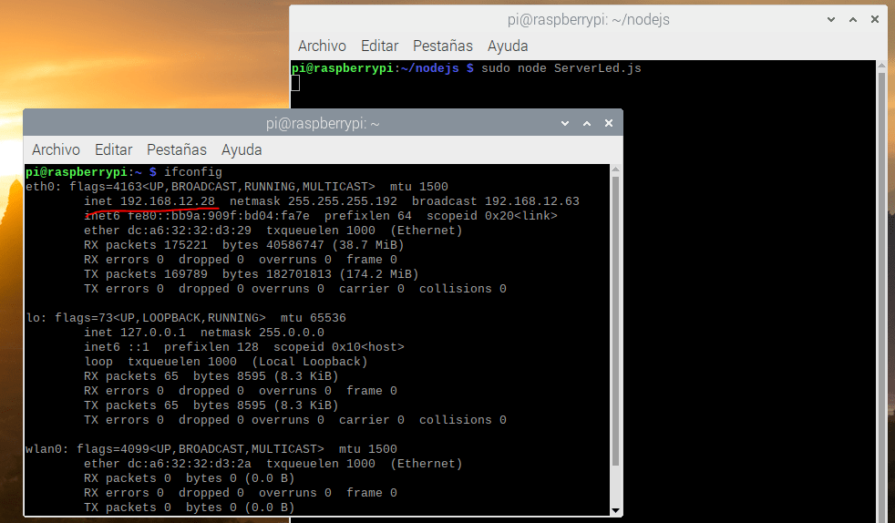 Para saber la ip de su Raspberry Pi bastará con abrir otra terminal y escribir el comando ifconfig que nos regresa algunos datos de la red, pero el que nos interesa es la variable inet si conectamos la raspberry pi por ethernet o wlan0 si es de forma inalámbrica.