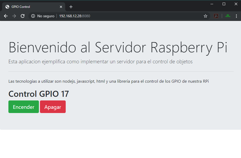 Entonces abrimos el navegador de nuestra PC, Teléfono o de la misma Raspberry y tecleamos la IP de la Raspberry Pi + el puerto 8080 en mi caso tengo que abrir esta url http://192.168.12.28:8080/