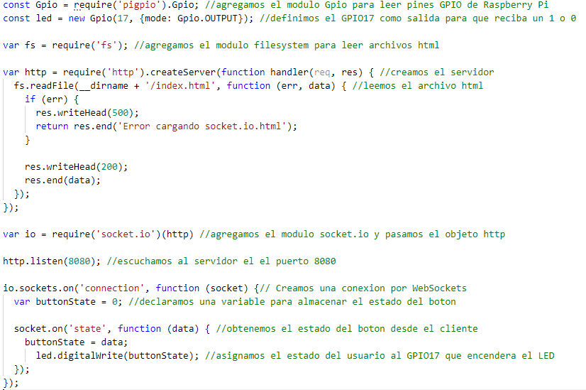 Nótese que el programa escrito para levantar el servidor (ServerLed.js) ya no es tan sencillo como el de hola mundo, sin embargo ya esta definida la estructura para escribir un pin en alto o bajo, en mi caso el GPIO17 pero puede agregar más pines u otro diferente, para este caso solo hay que agregar o cambiar los pines con una instrucciones como esta:
