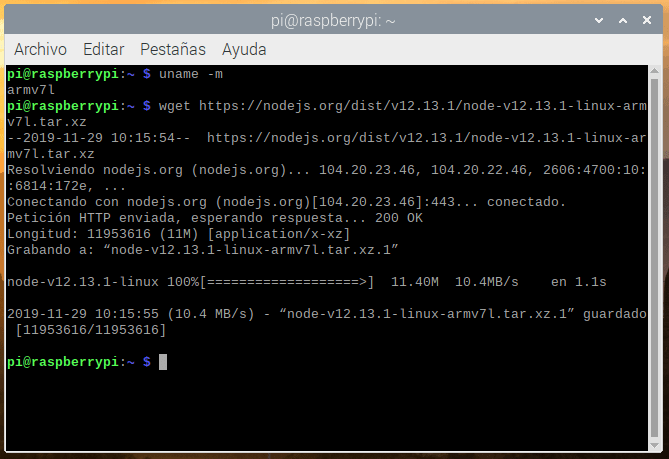 Si la respuesta es armv7, esta será la versión que necesitaremos descargar de la sección de descargas perteneciente a sitio oficial de node.js. En Raspberry Pi 4 nos aparece armv7 como se ve en la figura 1.