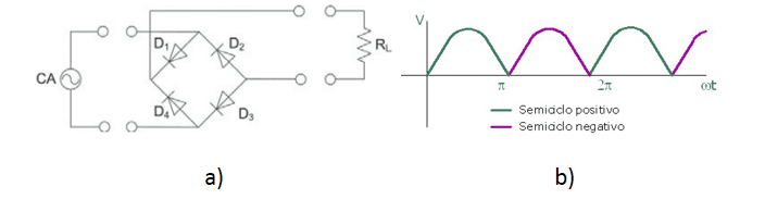2.2 Rectificador de onda completa: Los rectificadores de media onda tienen la desventaja de que la señal rectificada es nula durante la mitad del ciclo, lo cual supone una tensión efectiva de salida inferior. Para evitar esto, pueden utilizarse rectificadores de onda completa, como el que aparece en la Figura 6.a . Durante el semiciclo positivo, la corriente circulará por los diodos D1 y D3, mientras que durante el semiciclo negativo lo hará por D2 y D4. En ambos casos la corriente eléctrica atraviesa la carga en el mismo sentido, dando lugar a una intensidad con una forma de onda como la mostrada en la Figura 6.b. Este montaje recibe el nombre de puente de diodos, y su única desventaja es el requerir cuatro diodos en lugar de uno solo.