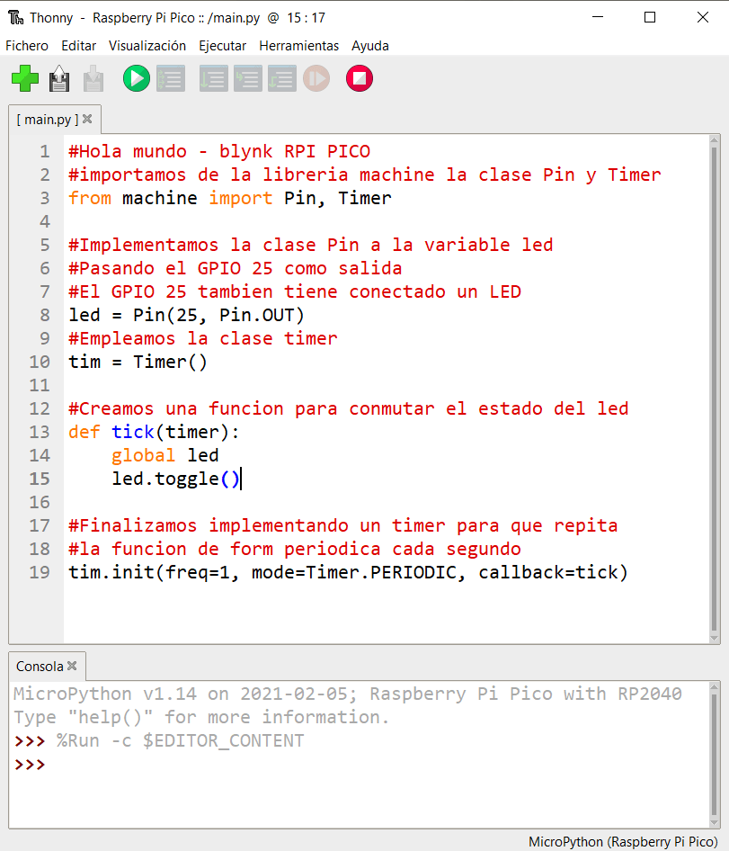 El led de color verde que ya viene conectado por default en nuestra tarjeta PICO en el GPIO25, el código se muestra en la siguiente imagen junto con comentarios que explican el mismo, después de escribir el código solo hay que dar click en el botón verde con el triangulo blanco para subir el programa a nuestra PICO.