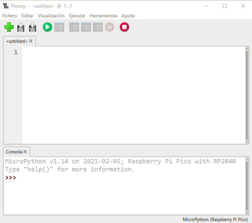 Por default el IDE viene configurado para actuar como un interprete del lenguaje Python en general, por lo que necesitamos cambiar este interprete por el de PICO.