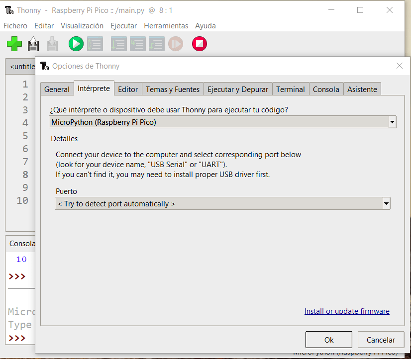 Ahora tendremos una lista de opciones de interpretes por lo que elegiremos la opción marcada como MicroPython (Raspberry Pi Pico), también podemos elegir el puerto serial COM de nuestra PICO pero es preferible dejar la opción como < Try detect port automatically > para siempre lo seleccione por nosotros como vemos en la siguiente imagen.
