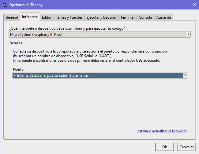 En la pestaña «Intérprete» seleccionamos la opción de Micro Python y en Puerto dejamos la opción de «< intentar detectar el puerto automáticamente>».