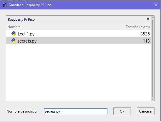 Guardamos en Raspberry Pi Pico con el nombre de “secrets.py” y damos click en “Ok”:
