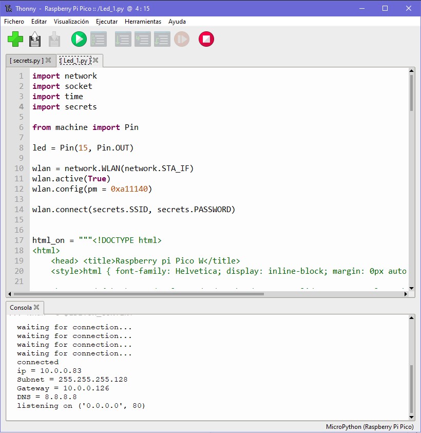 Si tenemos un LED conectado en el pin 15 y a GND veremos como enciende y apaga con el botón de la página web.